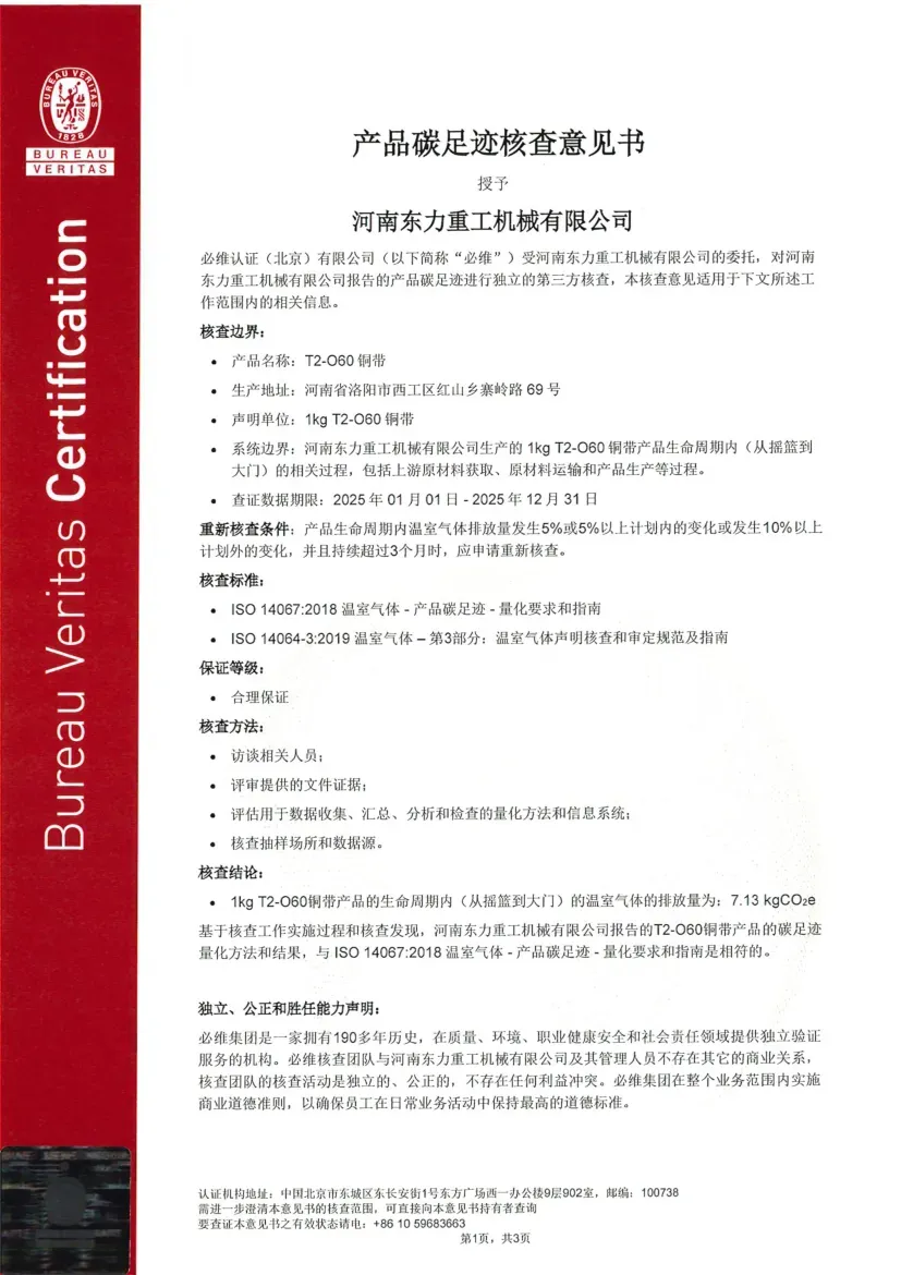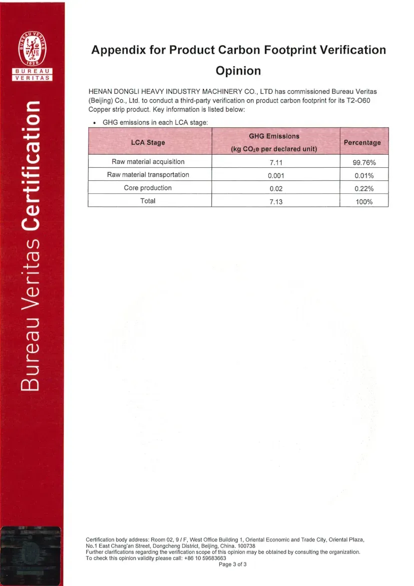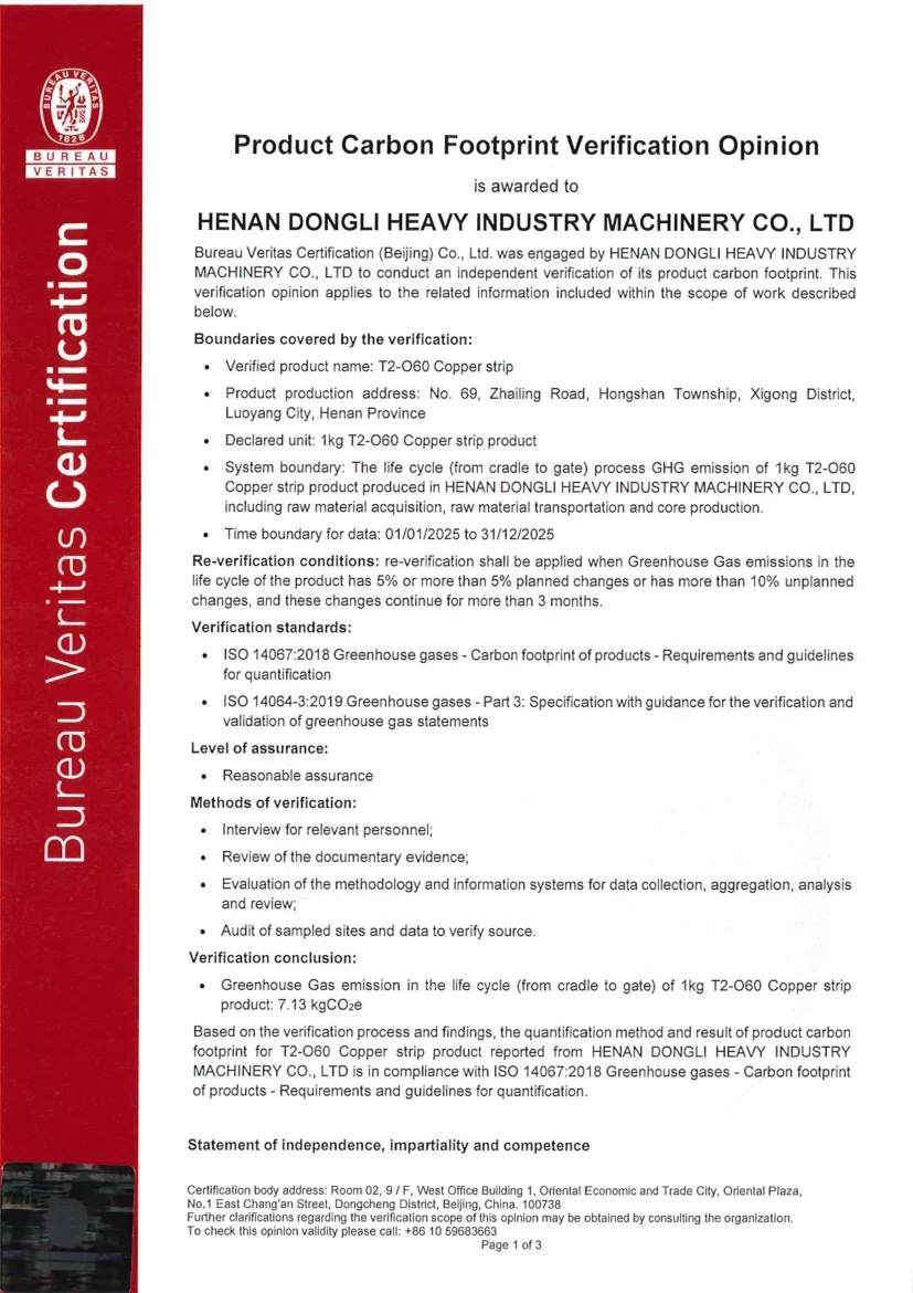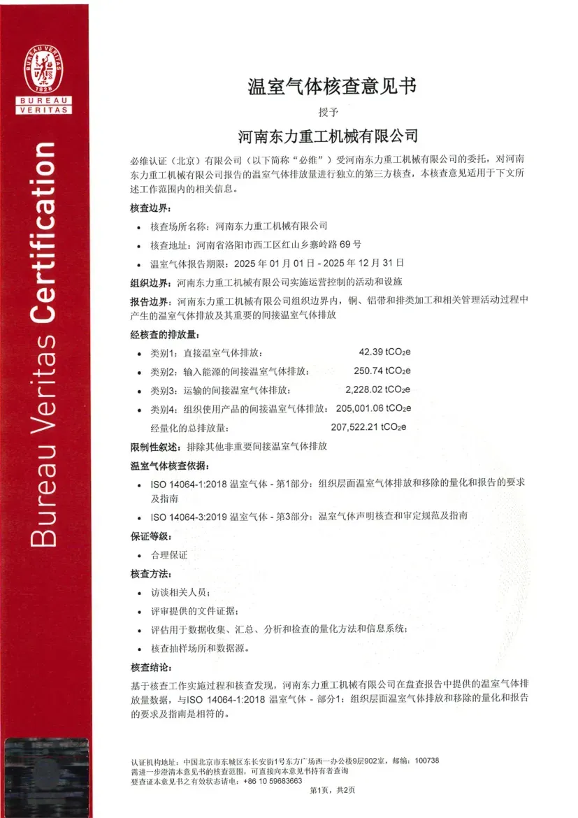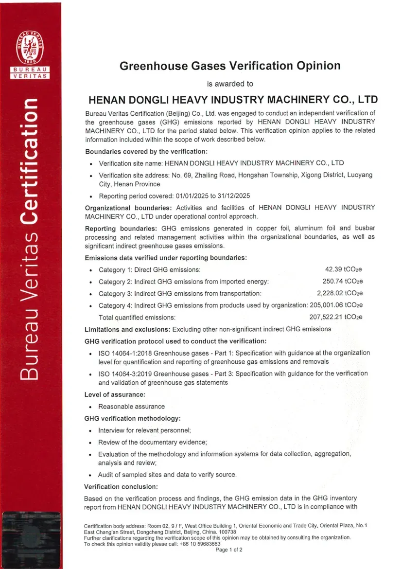 Certification Status under ISO 14064-1:2018: ISO 14064 is a standard designed for organizational-level carbon management, focusing on assisting enterprises in the accounting, reporting, and verification of greenhouse gas (GHG) emissions. Its objective is to help organizations establish a systematic carbon management framework, support the implementation of emission reduction projects, and ensure the reliability of carbon emission data. Recently, the greenhouse gas emission data for Dongli Heavy Industry is copper, aluminum strip, and plate processing and management activities were verified by Bureau Veritas (Beijing) Co., Ltd., confirming compliance with the requirements and guidelines of this standard (Reference No.: EMICN100777A).