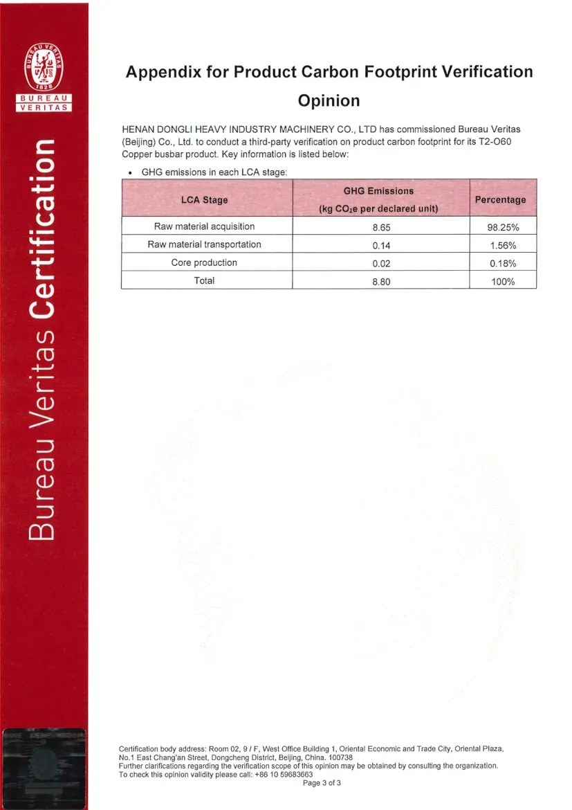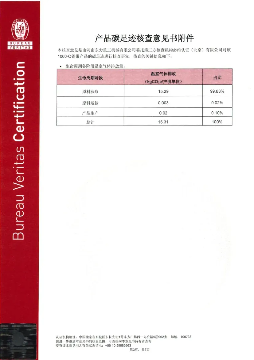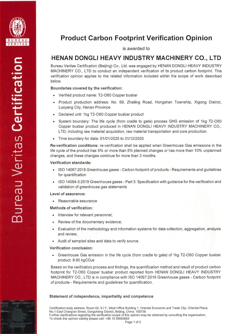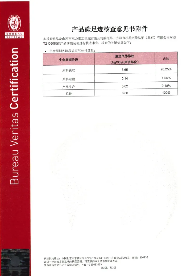 Certification Status under ISO 14064-1:2018: ISO 14064 is a standard designed for organizational-level carbon management, focusing on assisting enterprises in the accounting, reporting, and verification of greenhouse gas (GHG) emissions. Its objective is to help organizations establish a systematic carbon management framework, support the implementation of emission reduction projects, and ensure the reliability of carbon emission data. Recently, the greenhouse gas emission data for Dongli Heavy Industry is copper, aluminum strip, and plate processing and management activities were verified by Bureau Veritas (Beijing) Co., Ltd., confirming compliance with the requirements and guidelines of this standard (Reference No.: EMICN100777A).