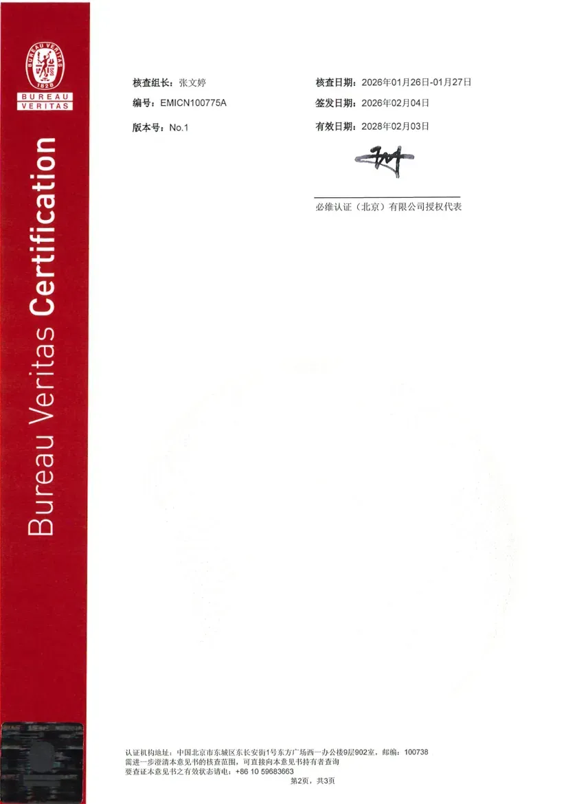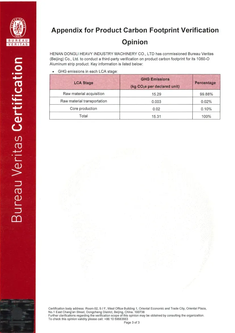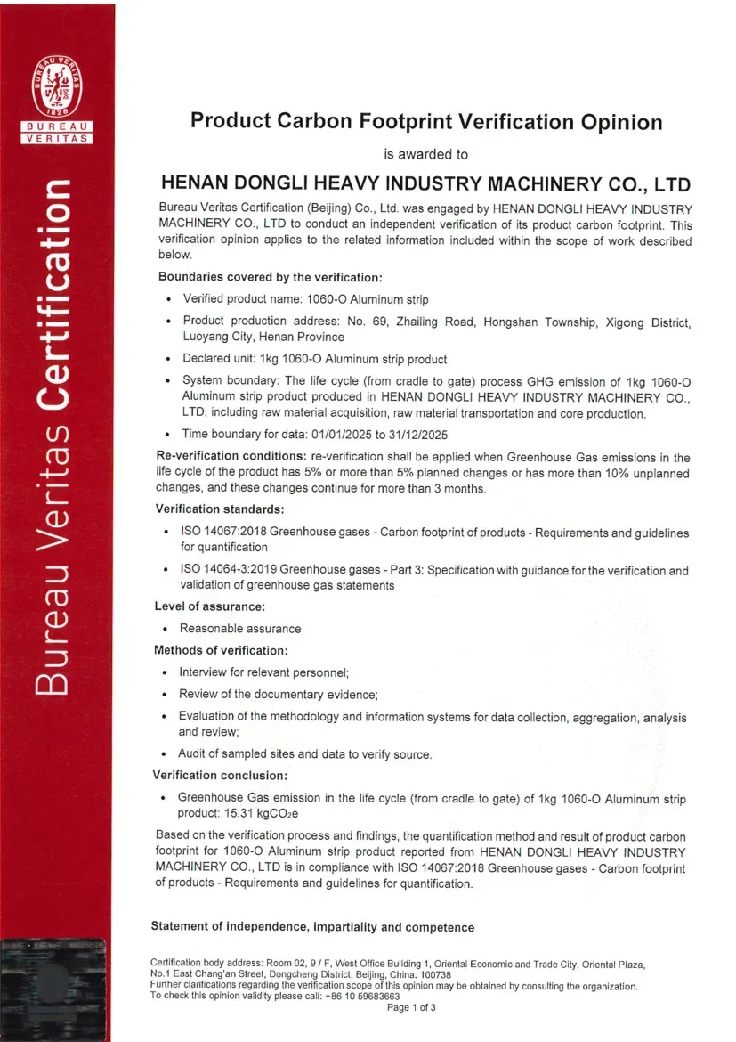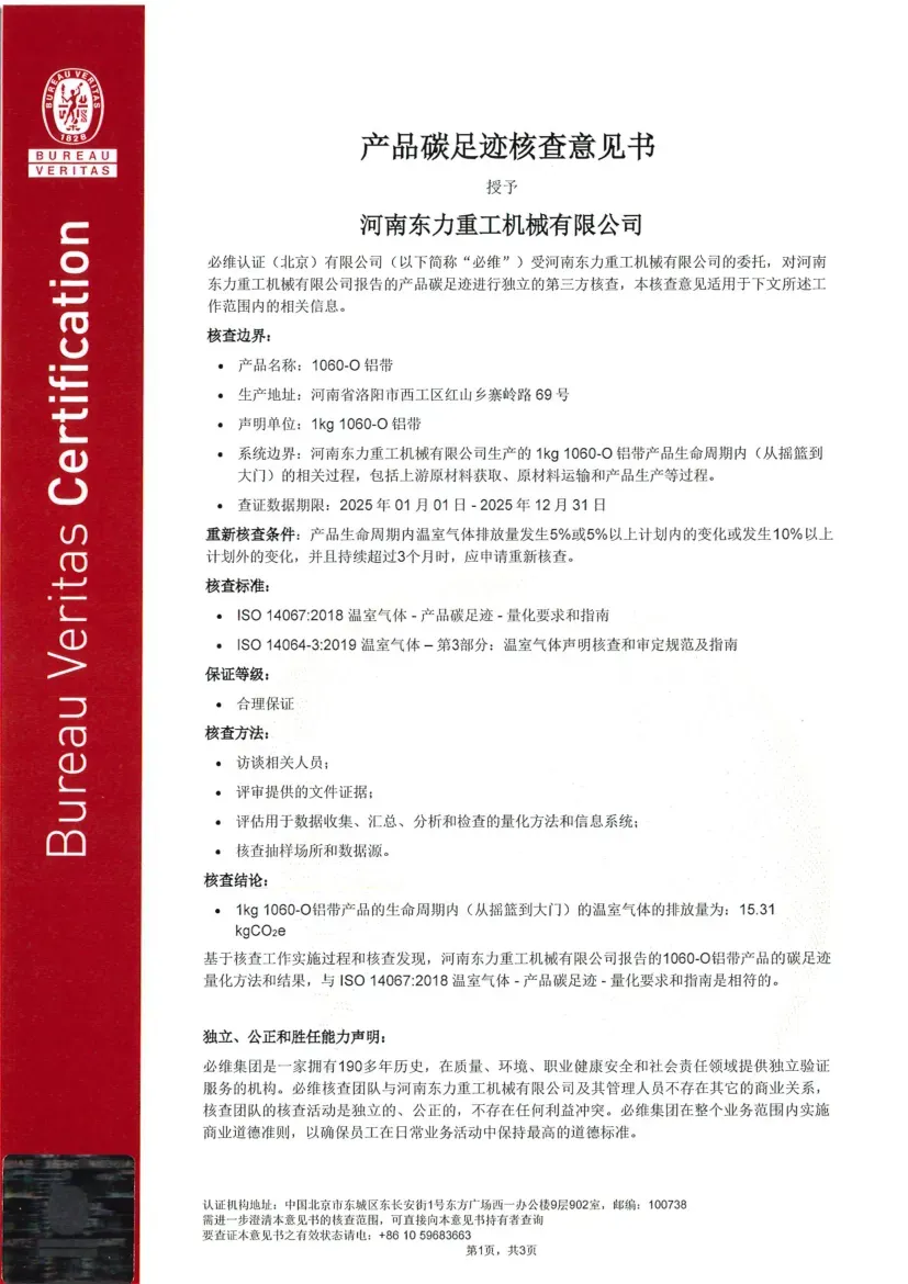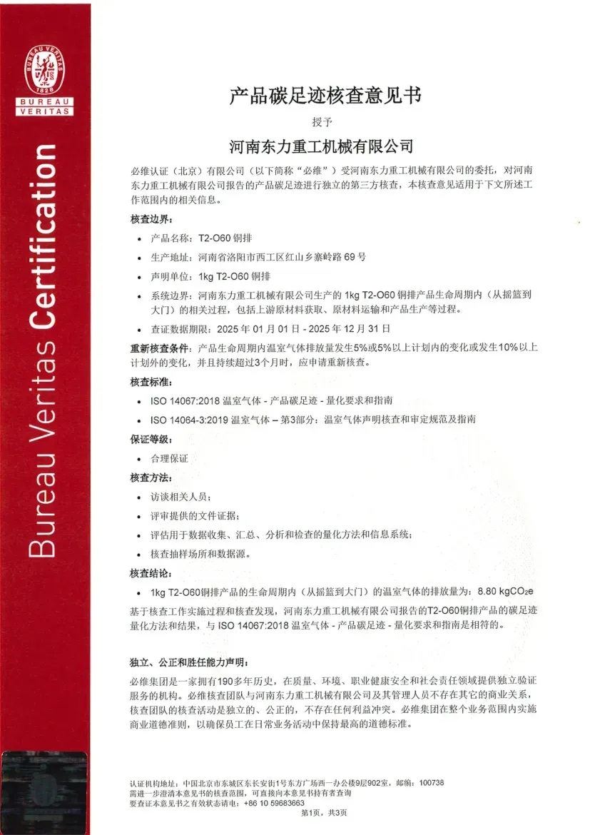 Certification Status under ISO 14064-1:2018: ISO 14064 is a standard designed for organizational-level carbon management, focusing on assisting enterprises in the accounting, reporting, and verification of greenhouse gas (GHG) emissions. Its objective is to help organizations establish a systematic carbon management framework, support the implementation of emission reduction projects, and ensure the reliability of carbon emission data. Recently, the greenhouse gas emission data for Dongli Heavy Industry is copper, aluminum strip, and plate processing and management activities were verified by Bureau Veritas (Beijing) Co., Ltd., confirming compliance with the requirements and guidelines of this standard (Reference No.: EMICN100777A).